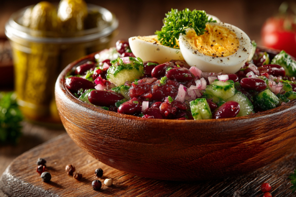 Знакомьтесь с салатом «Экономный» — настоящей палочкой-выручалочкой для тех, кто ценит бюджетные, но невероятно вкусные и сытные блюда без майонеза. Для него вам пригодятся баночка фасоли и маринованные огурцы.